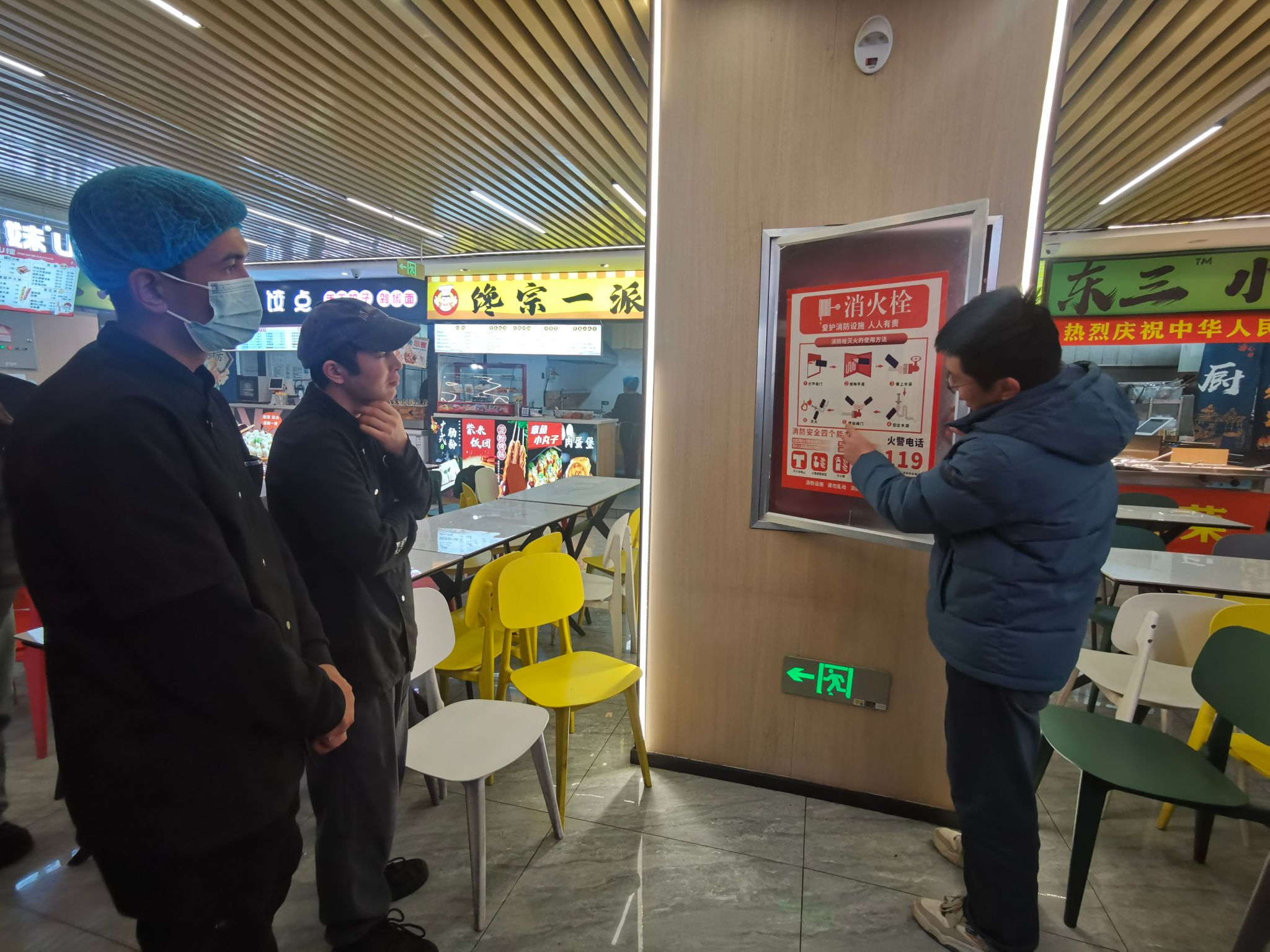 疏散演练结束后,商业服务科邀请新疆四合消防公司王工对东门市场商户从业人员进行消防器材使用专项培训。他详细介绍了干粉灭火器使用场景,分享灭火器“提、拔、握、压”的规范操作过程,通过提问互动方式讲解油锅起火、电线着火火情的处置措施,还对室内消防栓连接、使用和注意事项进行示范操作。